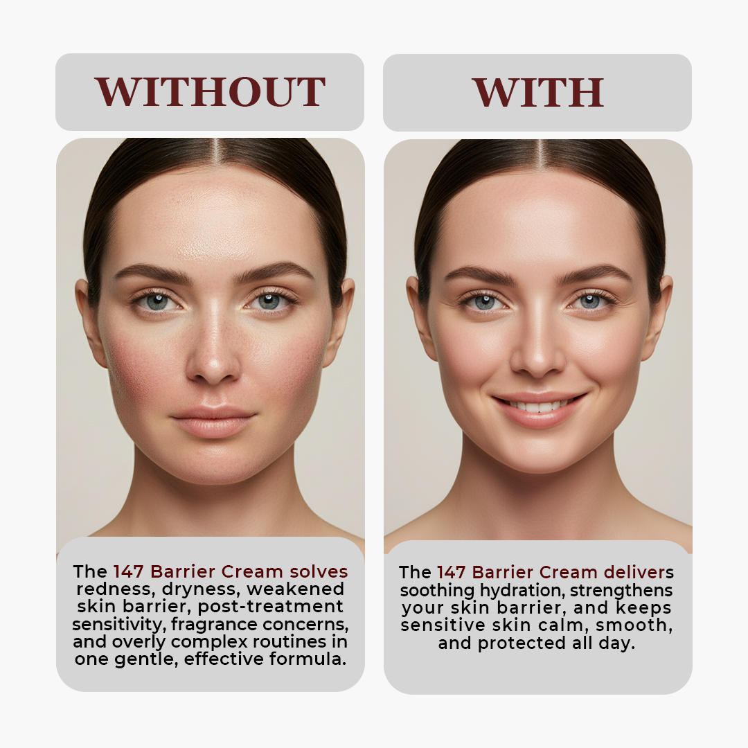 (After peels, retinol, or dermatology procedures, skin needs extra care. 147 Barrier Cream helps reduce stinging and supports healing.)